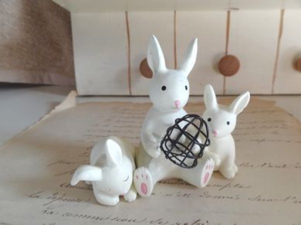 ウサギが鳥かごを持っている可愛い陶器のドールです。素朴な3びきのウサギがくっついていて可愛いです。お庭やインテリアにもぴったりです。大きさは横8.3cm、縦7.7cm位です。