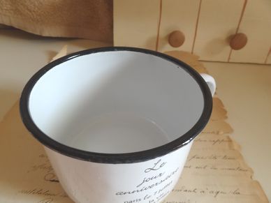 ナチュラルなデザインが素敵なホーローのマグです。英字がとっても素敵です。大きさは横13cm、縦7.5cm位です。