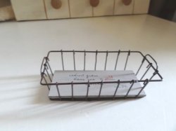 ナチュラルで可愛いワイヤーのバスケットです。底は木製で英字が素敵です。小物の収納やインテリアにも。大きさは横10cm、縦2.5cm、奥行き4.5cm位です。