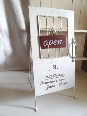 大きめのアンティーク風のドアのデザインのイーゼルです。ブリキ製になっています。OPENプレートがついていて下げられます。お庭やインテリアの飾りに素敵です。英字もフレンチ風デザインになってます。大きさは横18cm、縦35cm、開いた状態で奥行き17cm位です。