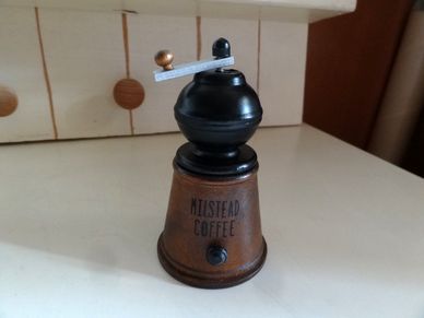 アンティークなデザインが素敵なミル型の鉛筆削りです。カフェをモチーフにしたデザインです。木製です。底の部分が鉛筆削りになっています。大きさは横4.7cm、縦8.4cm位です。