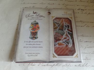 素敵なデザインのシールです。トレーシングペーパー素材の透け感のあるシールが大4柄、小4柄×4枚、計32枚入ってます。アルバムやノートのコラージュなどにも使えます。大きさはパッケージが横10.3cm、縦10.5cmです。