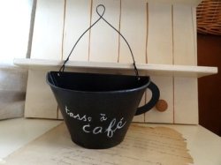 アンティーク風のデザインのおしゃれなカップです。ブリキ製でフレンチ風のデザインになってます。グリーンを入れたりインテリアにもぴったりです。底に穴が開いています。大きさは横19cm、高さ11.5cm、奥行き9.5cm、内径16cm×9cm位です。