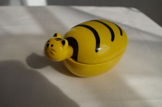 可愛いデザインの陶器の調味料ポットです。とってもキュートです。顔の部分がスプーンになっています。アクセサリーや小物入れにも。大きさは横5.5cm、縦4.6cm位です。