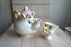 ディズニーの美女と野獣がデザインされた陶器のポットとマグカップのセットです。とっても素敵なデザインです。ポットには茶こし付きです。大きさはポットが横18cm、縦18cm位です。