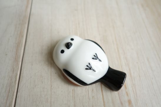 可愛いデザインのシマエナガの箸置きです。陶器製になってます。スプーンやお箸を乗せると木にとまっているようなデザインになります。大きさは横3.6cm、縦5.4cm位です。