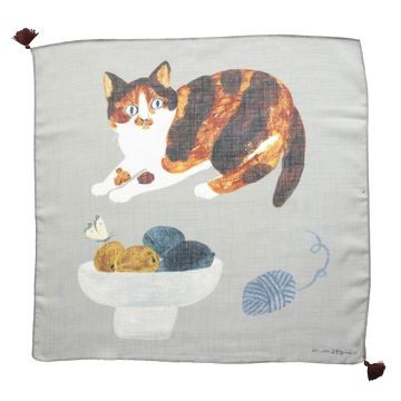 ふわっと柔らかな大きめサイズのタッセル付きクロスです。松尾ミユキさんが描く、暮らしの中のねこ達や植物の、静かで穏やかなワンシーンを切り取ったデザインになっています。