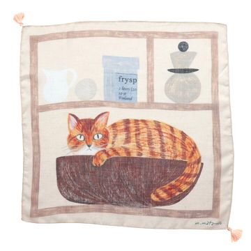 ふわっと柔らかな大きめサイズのタッセル付きクロスです。松尾ミユキさんが描く、暮らしの中のねこ達や植物の、静かで穏やかなワンシーンを切り取ったデザインになっています。