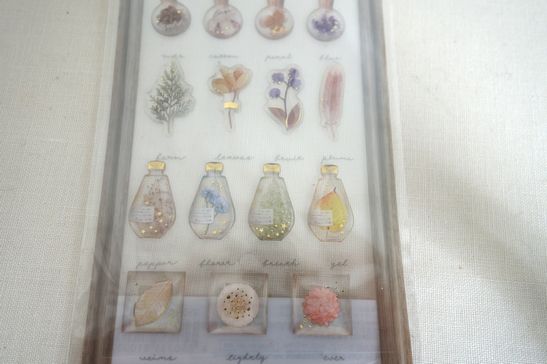 ガラスの容器に入ったようなおしゃれなドロップシールです。ノートや手帳、ラッピングやコラージュなどに使えます。大きさは台紙が横7cm、縦18cm位です。