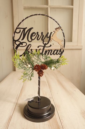 北欧風のスチールと合成樹脂製のLEDライト付きオーナメントです。周りに巻き付けたライトが光ります。お部屋のインテリアに。単3電池3本(別売り)使用です。大きさは横17cm、縦29.5cm位です。
