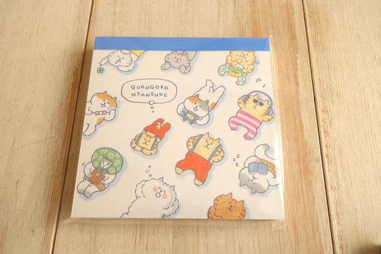 ごろごろにゃんすけ柄が可愛いスクエアメモです。2柄が各60枚合計120枚のメモです。大きさは横10cm、縦10cm、厚み1.3cm位です。