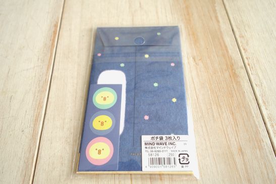 可愛いほっこりしたイラストが素敵なぽち袋です。3枚入りになっています。封シール付きです。大きさは横6.5cm、縦11cmです。