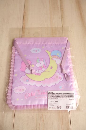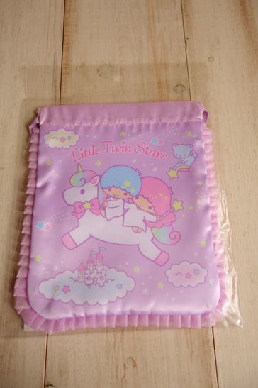 ファンシーなリトルツインスターズの巾着です。フリルがついた可愛いデザインです。小物の仕分けやギフトなどにも。素材はポリエステルです。大きさはフリル込みで横20cm、縦21.5cm位です。