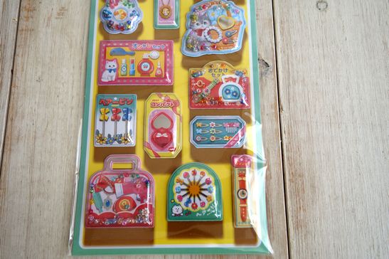 レトロなおもちゃがぷっくりしたカプセルに入ったようなシールです。ノートや手帳、携帯、シール帳などにも。中にビーズなども入っていてカシャカシャ、キラキラしたデザインがとっても可愛いです。大きさは横9cm、縦17.5cm位です。
