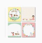 ほっこりイラストで描かれたハイジのデザインのブロックメモです。4柄になっています。4柄が各25枚、100枚のセットでたっぷり使えます。大きさは縦9.3cm、横9cm、厚み1.1cm位です。
