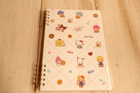 レトロなお菓子とサンリオキャラクターの柄がキュートなデザインのリングノートです。持ち運びしやすいB6サイズです。たっぷり70枚、140ページです。中は薄い方眼でとても使いやすいです。大きさは横13cm、縦18.2cm位です。