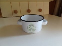 アンティーク風のデザインのおしゃれなキャセロールです。ホーロー製になっています。グリーンを入れたりインテリアにもぴったりです。大きさは横11cm、高さ4.5cm位です。