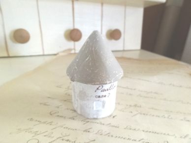 ナチュラルなデザインの石膏で出来たようなハウスオーナメントです。アンティーク風になってます。インテリアに。中身は素焼になっています。大きさは横4.2cm、縦6.3cm位です。